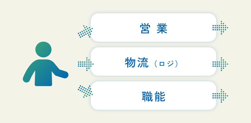 当社では「営業」「物流(ロジ)」「職能」をキャリアの軸(キャリアグループ)と定め、社員一人ひとりに対してキャリアグループへの紐付けを行います。